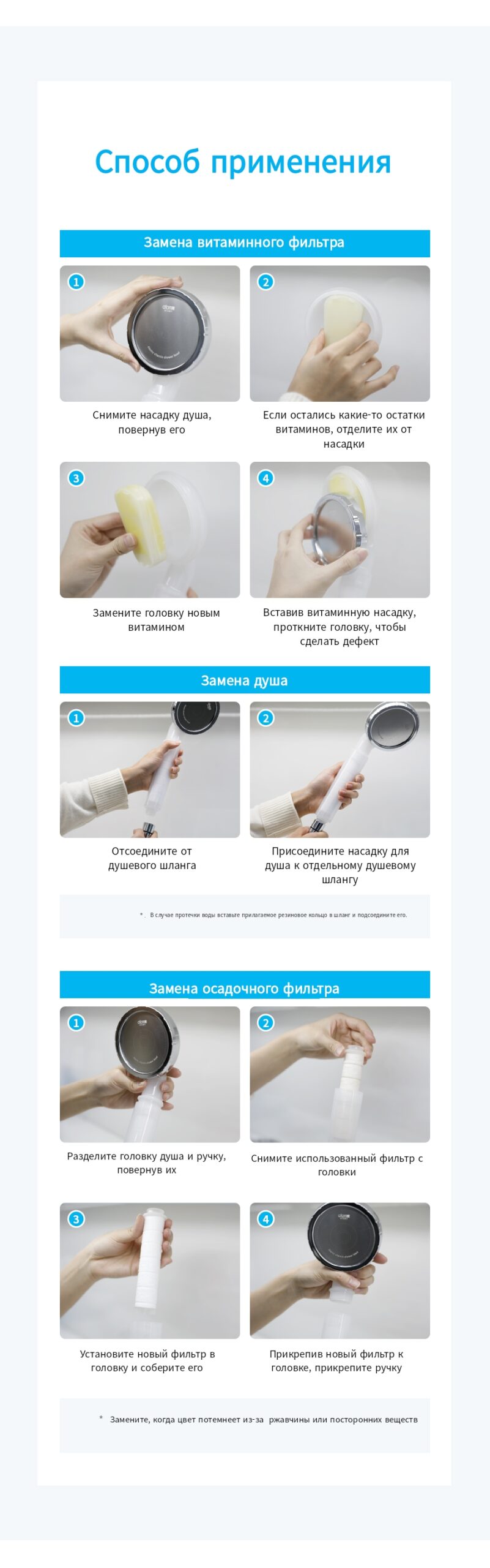 Метод замены фильтра и замена витаминного фильтра: Снимите насадку для душа, повернув её. Если остались витаминные остатки, отделите оставшиеся витамины. Заменить и объединить новые витамины